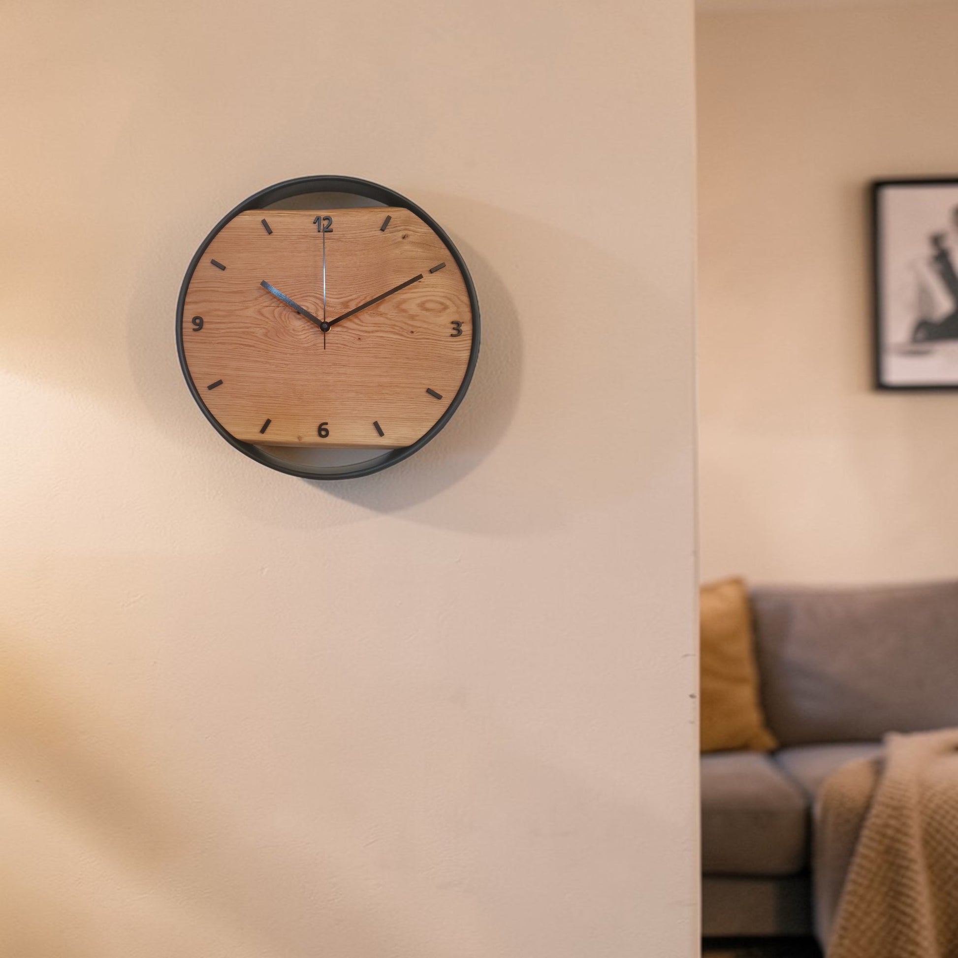 Wanduhr aus massiver Eiche mit klassischen Ziffern und Sekundenzeiger. Der 35cm große Durchmesser macht sie zum Blickfang in jedem Raum. Handgefertigt aus hochwertigen Materialien mit natürlicher Holzmaserung.